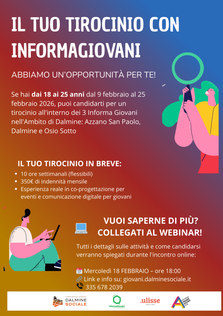 Se hai dai 18 ai 25 anni, puoi inviare la tua candidatura per uno dei 3 tirocini all'interno dei 3 Informagiovani dell’Ambito di Dalmine: Azzano San Paolo, Dalmine e Osio Sotto!