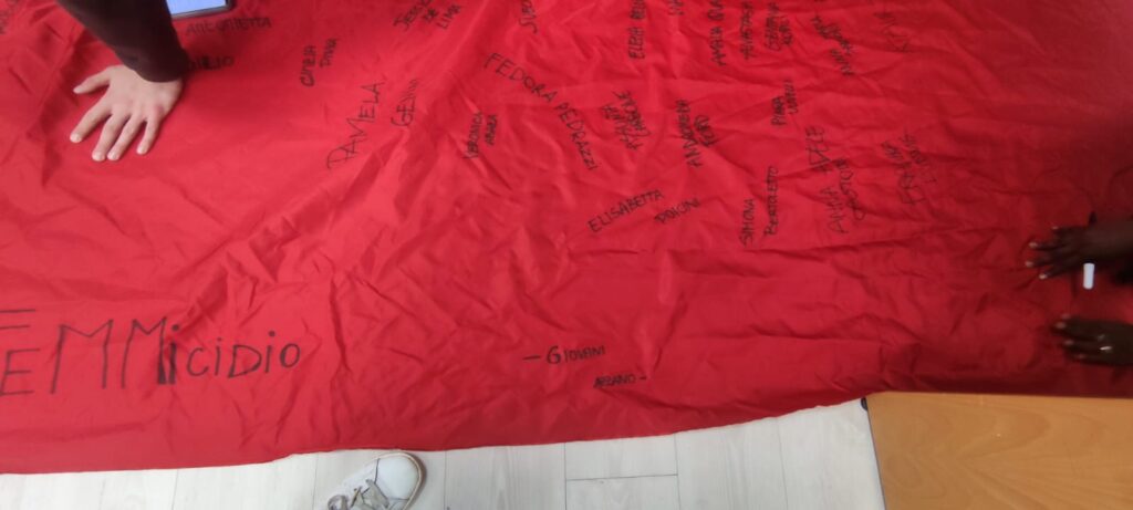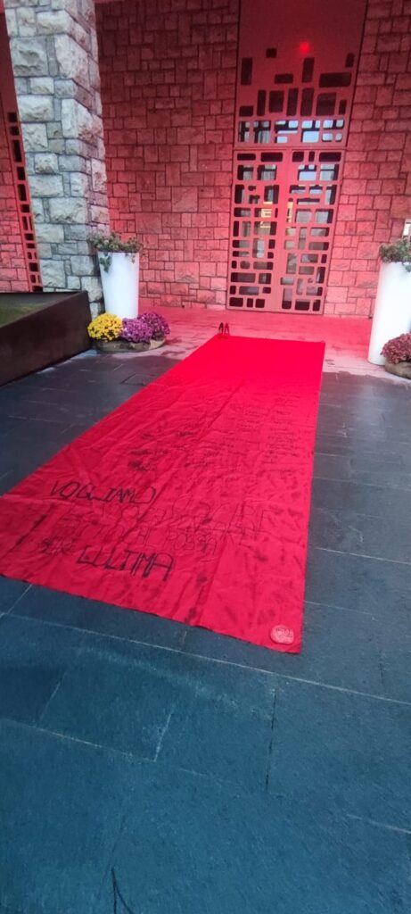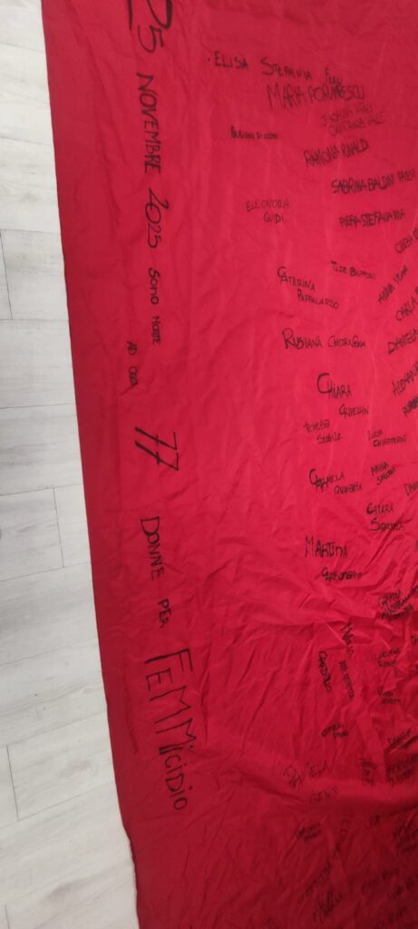 - Il Drappo Rosso e i Nomi: Un grande telo di tessuto rosso, colore simbolo della lotta al femminicidio e ripreso dall'installazione Zapatos Rojos (Scarpe Rosse), è stato steso, ricoperto di nomi e frasi. USCIRE E ADOVER PENSARE TOCHE POSSA" (una frase che sottolinea la libertà di movimento e di pensiero senza paura)