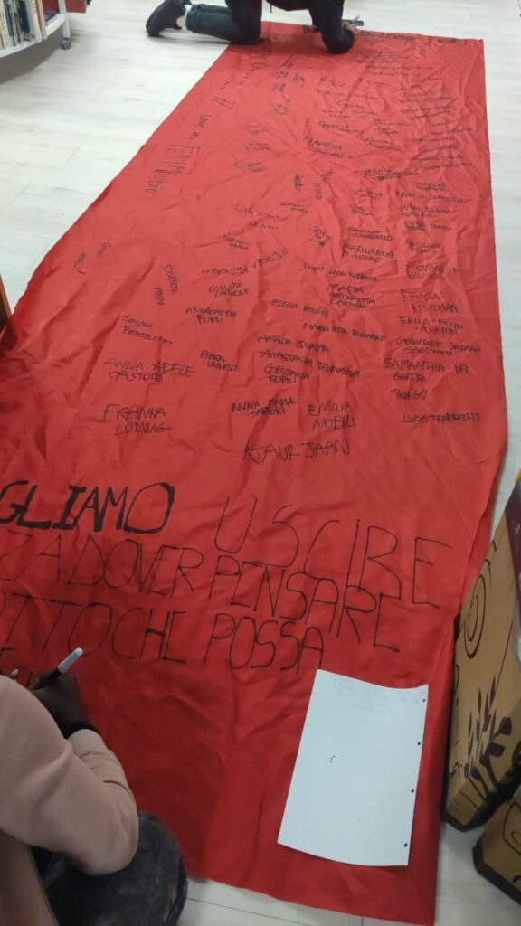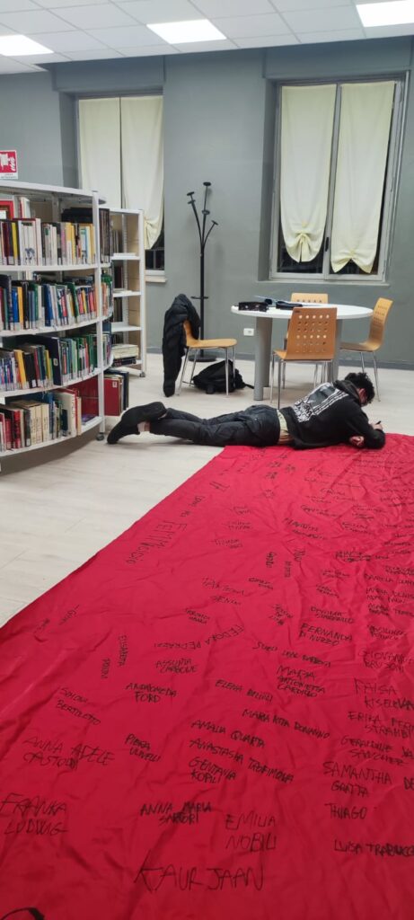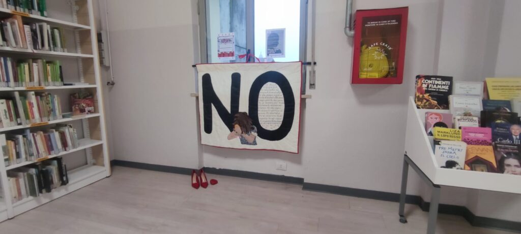 - Le Scarpe Rosse: Simbolo internazionale delle vittime di femminicidio, un paio di eleganti scarpe rosse con il tacco sono state posizionate davanti a un arazzo esposto in biblioteca e all'esterno, a rappresentare il vuoto lasciato.